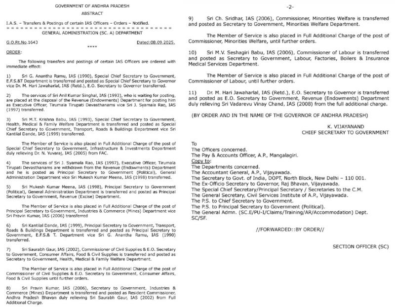 జి. అనంత రామును పర్యావరణం, అడవులు, సైన్స్ అండ్ టెక్నాలజీ శాఖల ప్రత్యేక ప్రధాన కార్యదర్శిగా బదిలీ చేసి, ప్రభుత్వ ప్రత్యేక ప్రధాన కార్యదర్శిగా నియమించారు. ఆయన స్థానంలో డాక్టర్ ఎం. హరి జవహర్ లాల్ (ఐఏఎస్, రిటైర్డ్) ని భర్తీ చేశారు.