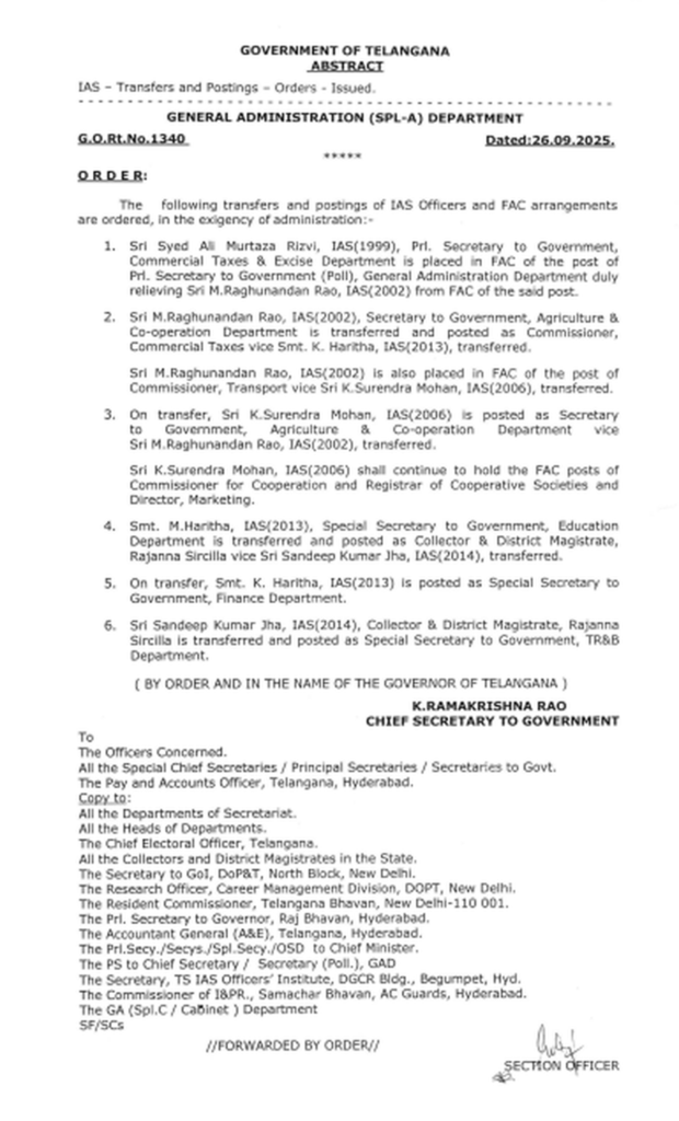 అదే సమయంలో, రఘునందన్ రావు వ్యవసాయం & సహకారం శాఖ కార్యదర్శిగా ఉన్నారు. వారిని వాణిజ్య పన్నుల కమిషనర్ గా బదిలీ చేశారు. ఈ స్థానంలో కె. హరిత ( K. Haritha, IAS ) (2013 బ్యాచ్) ను ప్రస్తుతం ఉన్న స్థానం నుంచి తొలగించారు. అలాగే, రఘునందన్ రావుకు రవాణా కమిషనర్ హోదాలో కూడా FAC అప్పగించారు. ఈ బాధ్యతలు ఇంతకు ముందు కె. సురేంద్ర మోహన్ ( K. Surendra Mohan, IAS ) (2006 బ్యాచ్) చూస్తున్నారు.
