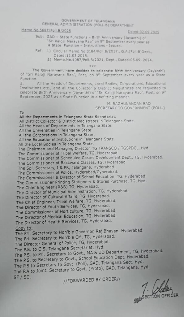 తెలంగాణ ప్రభుత్వం ప్రముఖ కవి, సాహిత్య వేత్త శ్రీ కాలోజీ నారాయణ రావు జయంతిని ప్రతి సంవత్సరం సెప్టెంబర్ 9న రాష్ట్ర వేడుకగా నిర్వహించాలని నిర్ణయించింది. ( kaloji narayana rao birth anniversary )
